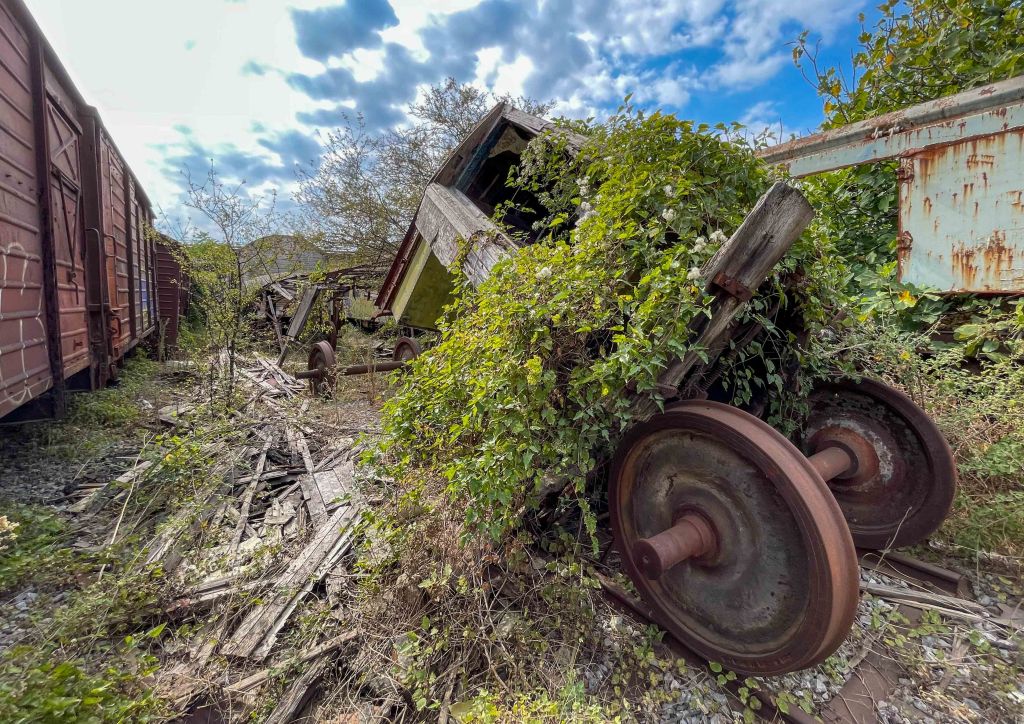Today there is a colorful mix of different passenger, cargo and tank wagons spread over several parallel side rail tracks, which are no longer used anymore. Trees and bushes have made their way through and grow nowadays between the trains, giving the entire location a mysterious atmosphere. If you fight your way through the undergrowth, you can even go inside the train wagons and feel a touch of travelling through Greece by train in the last century.