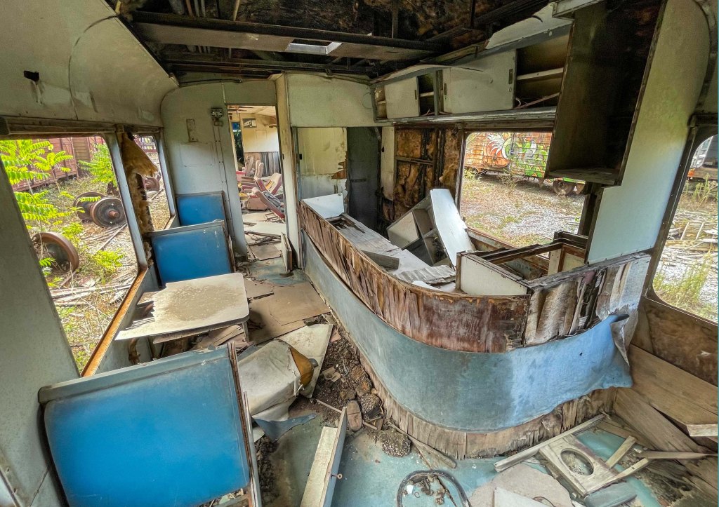 While some cargo coaches continue to carry their original freight, the former long-haul passenger wagons are still reflecting the comfort of traveling in the 1960s and 1970s with having their luxurious seats, beds and bars there until now. But you should have in mind that also wind, weather and vandalism have left their marks over the last decades, which is why most of the trains are heavily damaged.