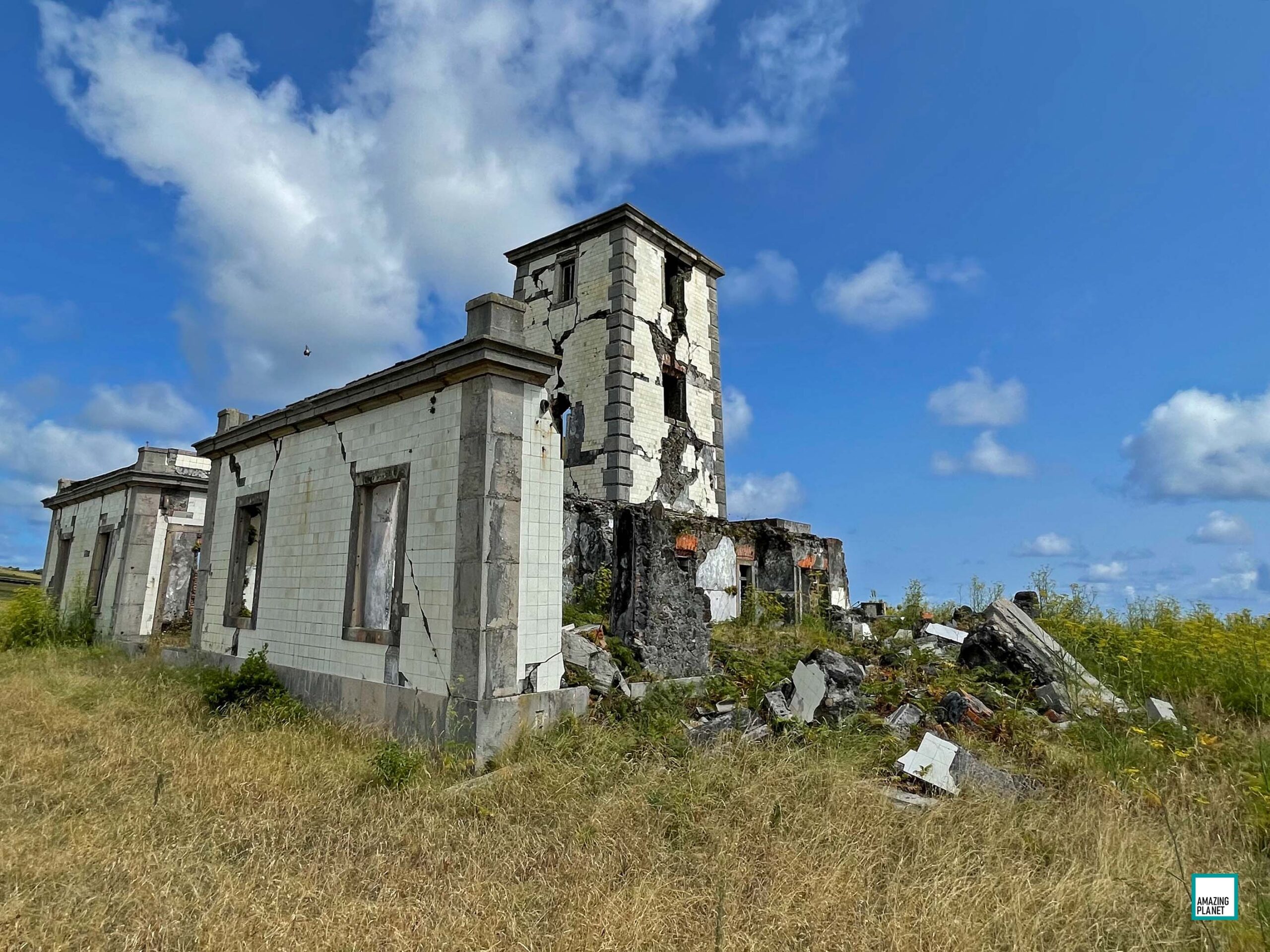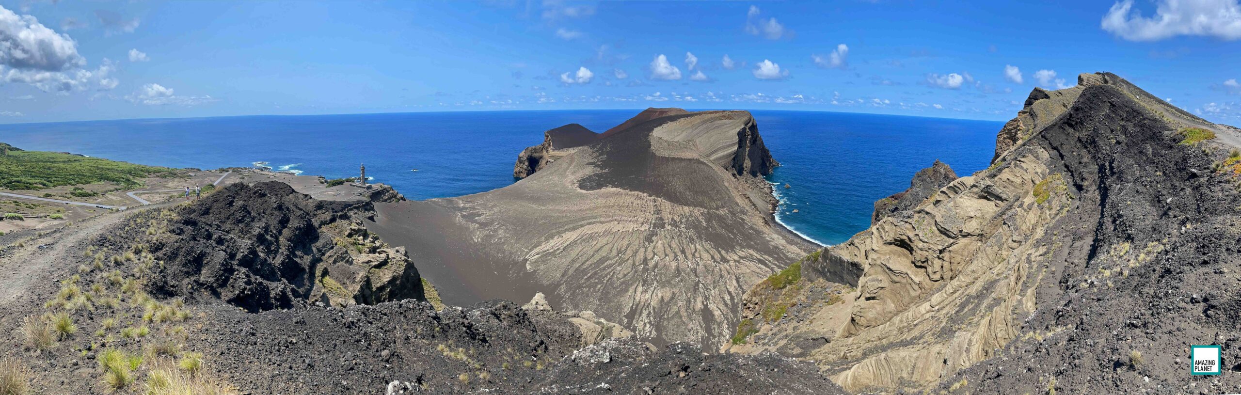 Faial island spots: Ruin of the former lighthouse „Farol da Ribeirinha“, Capelinhos volcano, marina of Horta with a view of the Pico volcano